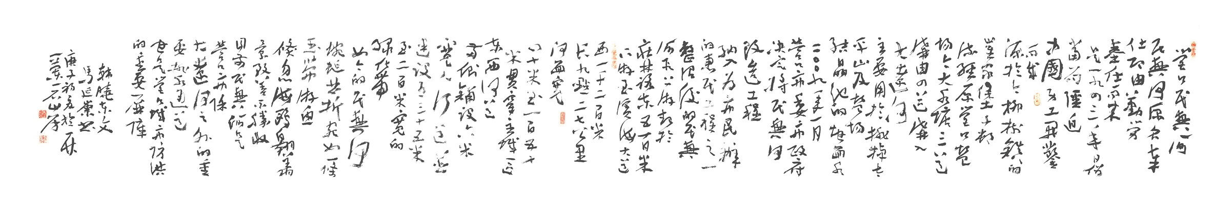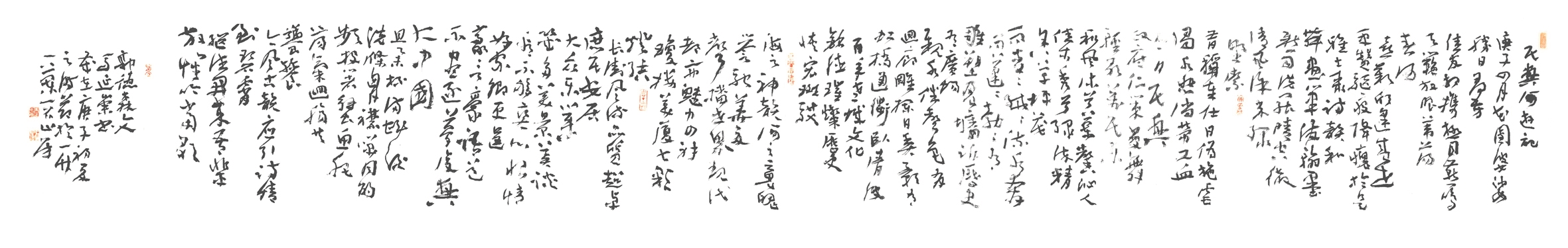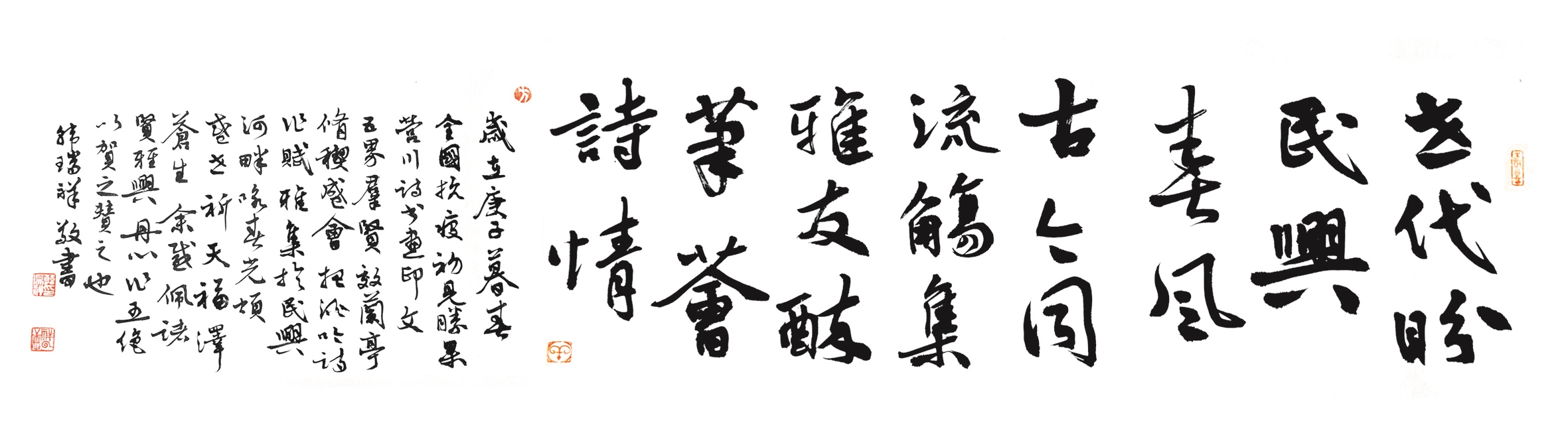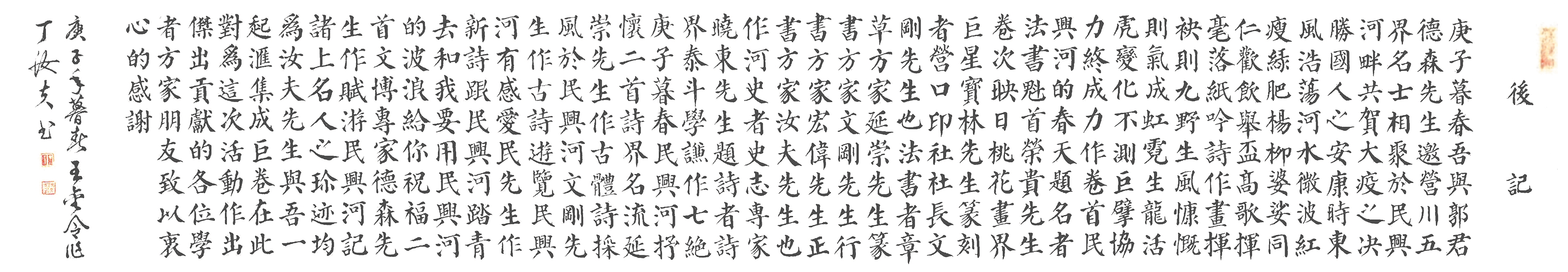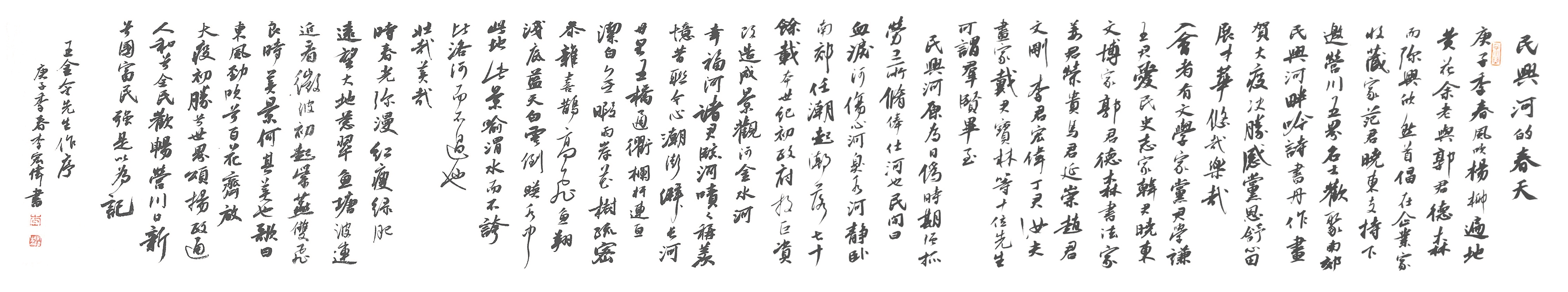 庚子暮春,吾与郭君德森先生邀营川五界名士,相聚于民兴河畔,共贺大疫之决胜,国人之安康。时东风浩荡,河水微波,红瘦绿肥,杨柳婆娑。同仁欢饮,举杯高歌,挥毫落纸,吟诗作画。挥袂则九野生风,慷慨则气成虹霓。生龙活虎,变化不测,巨擘协力,终成力作。卷首《民兴河的春天》题名者:书法魁首荣贵先生;卷次《映日桃花》,画界巨星宝林先生;篆刻者:营口印社社长文刚先生也。法书者:章草方家延崇先生、篆书方家文刚先生、行书方家宏伟先生、正书方家汝夫先生也。作河史者:史志专家晓东先生。题诗者:诗界泰斗学谦作七绝:《庚子暮春民兴河抒怀》二首;诗界名流延崇先生作古体诗:《采风于民兴河》;文刚先生作古诗:《游览民兴河有感》;爱民先生作新诗《跟民兴河踏青去》和《我要用民兴河的波浪,给你祝福》二首。文博专家德森先生作赋《游民兴河记》。诸上名人之珍迹均为汝夫先生与吾一起汇集成巨卷。在此,对为这次活动作出杰出贡献的各位学者、方家、朋友致以衷心的感谢!