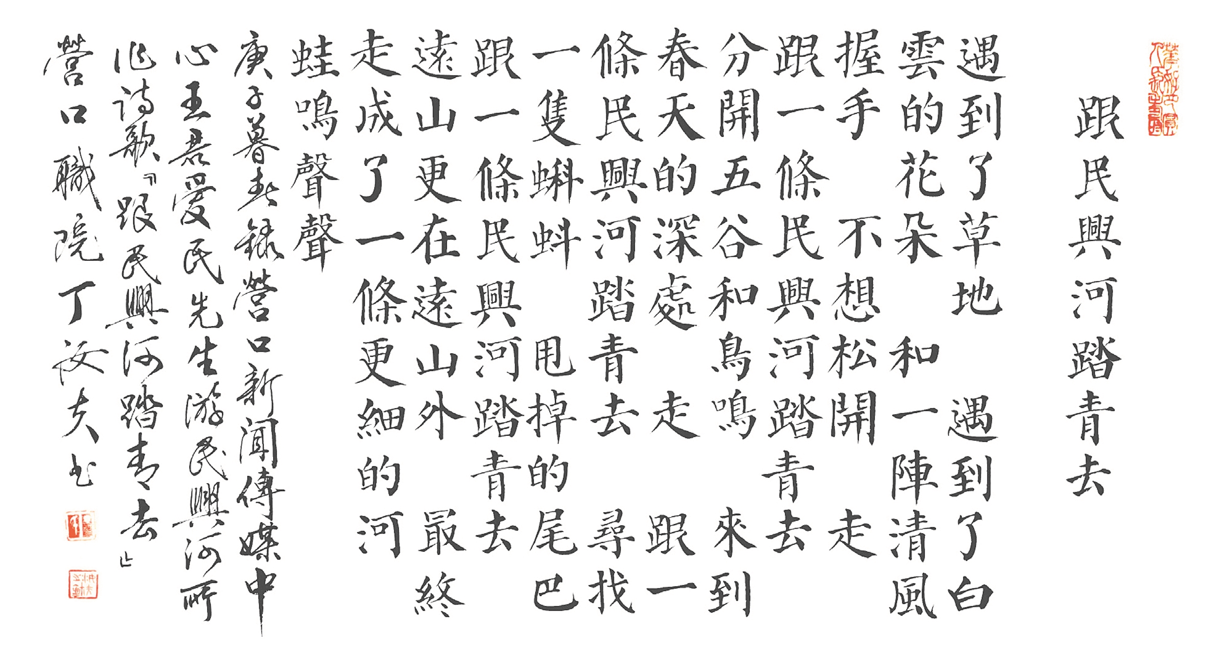 遇到了草地 遇到了白云的花朵 和一阵清风握手 不想松开 走 跟一条民兴河踏青去 分开五谷和鸟鸣 来到春天的深处 走 跟一条民兴河踏青去 寻找一只蝌蚪 甩掉的尾巴 跟一条民兴河踏青去 远山更在远山外 最终走成了一条更细的河 蛙鸣声声