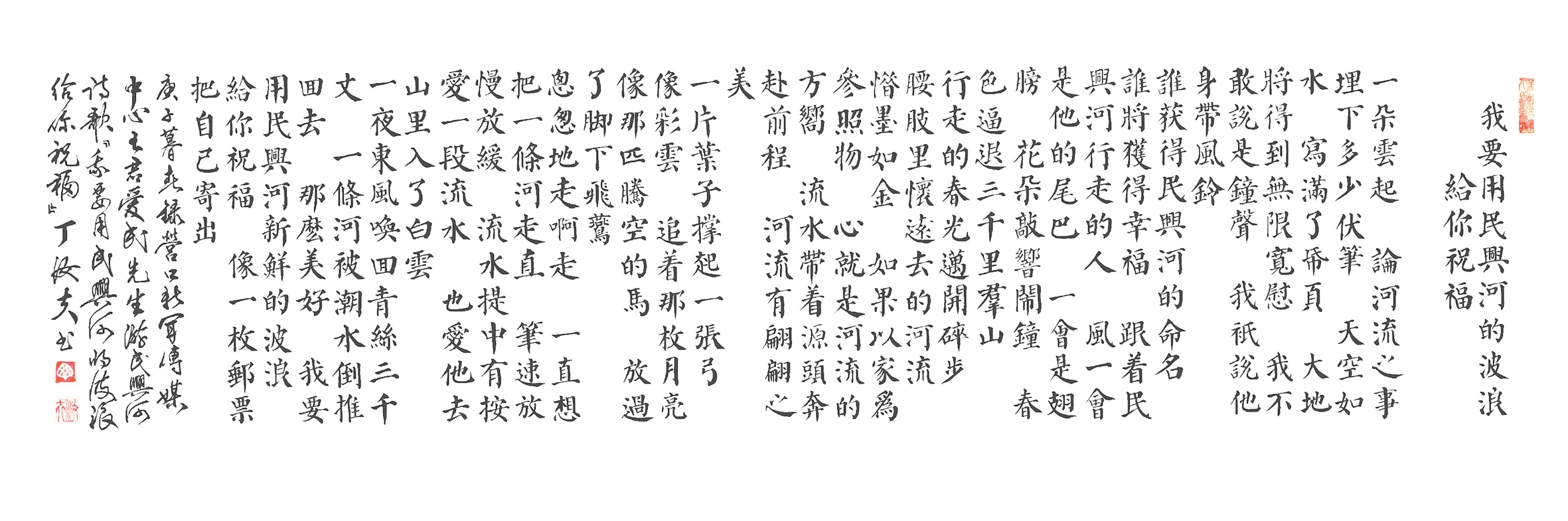 一朵云起 论河流之事埋下多少伏笔 天空如水 写满了纸页 大地将得到无限宽慰 我不敢说是钟声 我只说他身带风铃 谁获得民兴河的命名 谁将获得幸福 跟着民兴河行走的人 风一会是他的尾巴 一会是翅膀 花朵敲响闹钟 春色逼退三千里群山 行走的春光迈开碎步 腰肢里怀远去的河流 惜墨如金 如果以家为参照物 心就是河流的方向 流水带着源头奔赴前程 河流有翩翩之美 一片叶子撑起一张弓 像彩云 追着那枚月亮 像那匹腾空的马 放过了脚下飞燕 匆匆地走啊走 一直想把一条河走直 笔速放慢放缓 流水提中有按 爱一段流水 也爱他去山里入了白云 一夜东风唤回青丝三千丈 一条河被潮水倒推回去 那么美好 我要用民兴河新鲜的波浪给你祝福 像一枚邮票把自己寄出