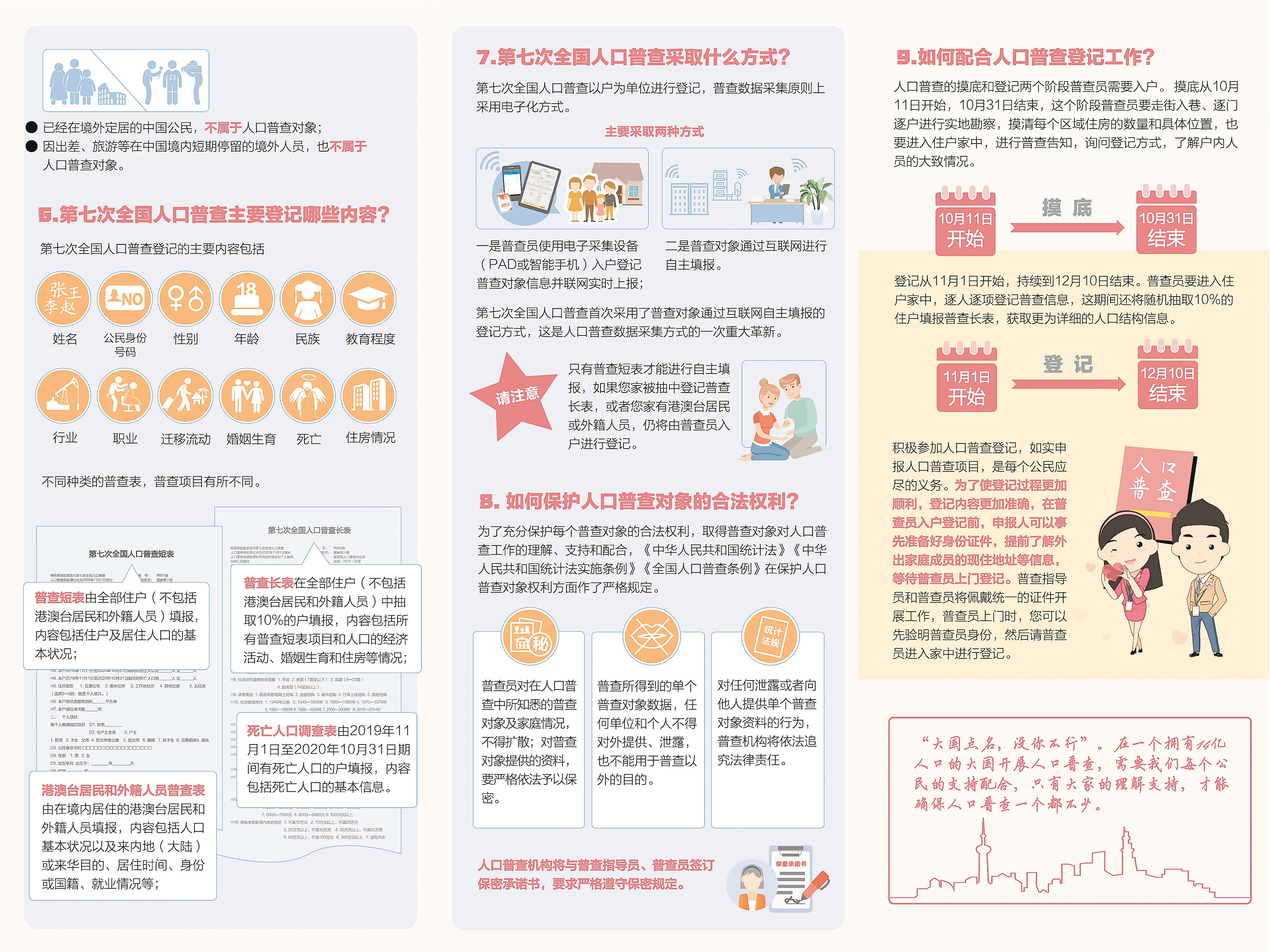 五、依据《中华人民共和国统计法》和《全国人口普查条例》规定,公民有义务配合人口普查,如实提供普查所需资料。各级普查机构及其工作人员,对普查对象的个人信息必须严格保密。