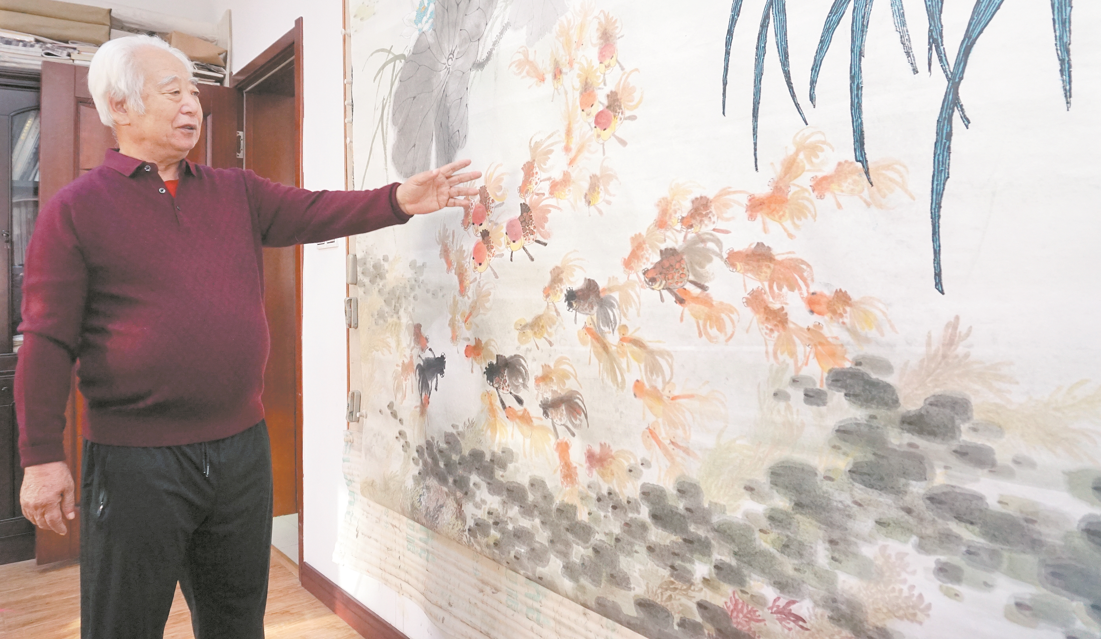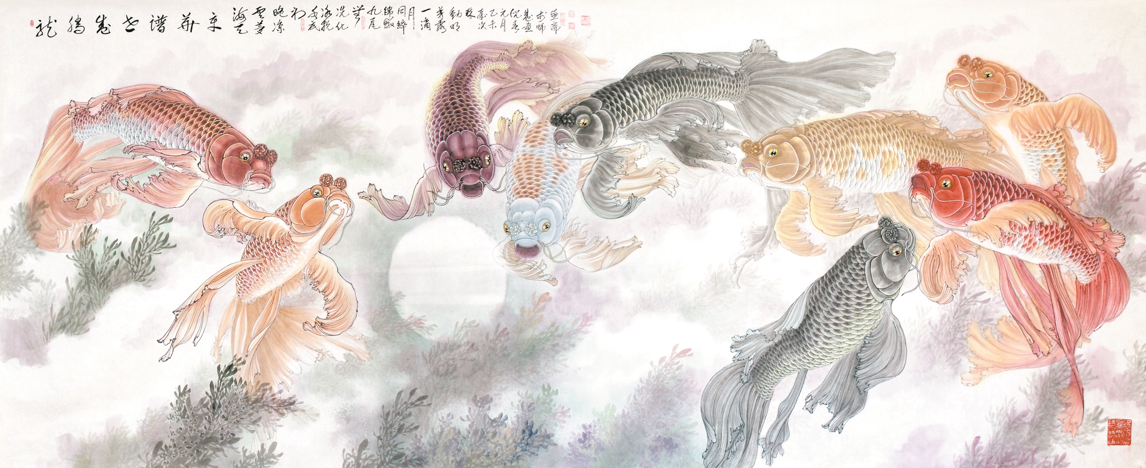 倪春盛笔下的金鱼飞跃了龙门,风格独树,异彩纷呈。他对于把握金鱼的形状、造型,展现季节的色彩、变化,显示画面的疏密、浓淡……都游刃有“鱼”,挥洒自如。从三两只金鱼的斗方到大大小小的中堂直至5米多长的百鱼图,皆活灵活现,妙笔生辉。通过“倪式小写意金鱼表现技法”,观众感受到了大千世界的千姿百态以及力争上游的勃勃生机。倪春盛告诉记者,世界上的金鱼有100多种,从古至今,画家们大多围绕1个种类进行艺术创作,而他可以画出9个品种的金鱼,为此付出了数十年努力。那大大小小、外形不一的金鱼,或清浅淡雅,或浓墨古朴,或斑斓华丽,个个锦鳞闪烁、飘逸轻灵、活泼可爱、自由自在。他还说,自己经常给作品题名“金玉满堂”,此句出自《老子》,形容财富极多,也比喻学识丰富。就是说,画家既希望自己创作的小精灵喜庆吉祥、人见人爱,又不断勉励自己厚积薄发、再上层楼。金鱼亦师亦友,与倪春盛的人生水乳交融。他为自己取字金彧,号师鱼斋主人。