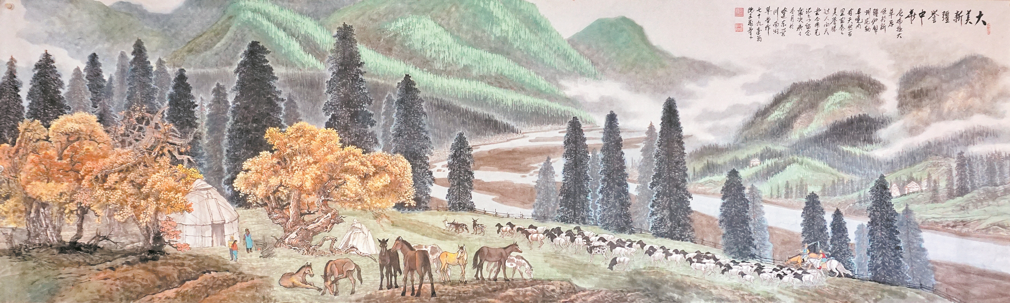 面对一系列成就,倪春盛追求艺术的脚步不曾迟滞。48岁那年,他走进天高地阔、山奇水异的新疆,开始了长达18年的创作。那灼灼赤地上千仞斜倚、峭壁兀立的天山余脉,那塔松座座、绿草茵茵、白色毡房内外飘荡着奶茶和鲜花香气的那拉提风光,那融入工笔和小写意手法、枯木逢春又是一片生机盎然的金色胡杨,都在其四五米长的大幅画纸上展现出遒劲与生机、自信和情趣、厚重沉稳而酣畅淋漓。2003、2016年,他两次在乌鲁木齐举办了新疆山水画展。