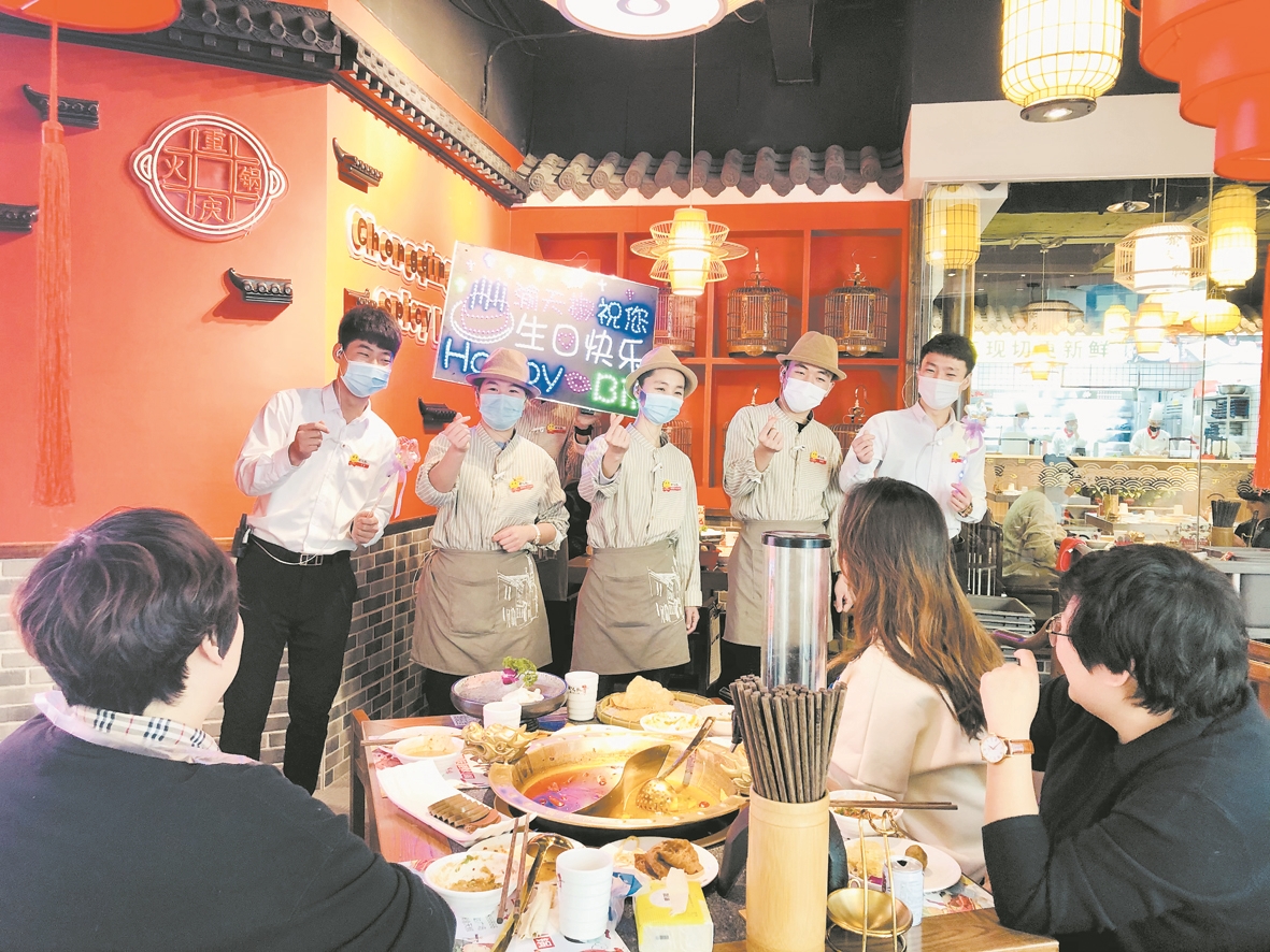 “生日与朋友去饭店吃饭,还能收到一份祝福,真温馨!”日前,市民肖女士在我市一家火锅店庆祝生日时,突然音乐响起,只见几名服务员唱着生日歌、手持荧光棒、高举生日牌走到桌前,为她送上生日祝福。“生日过得很特别,这样的服务真贴心!”店内就餐的顾客纷纷赞叹。
