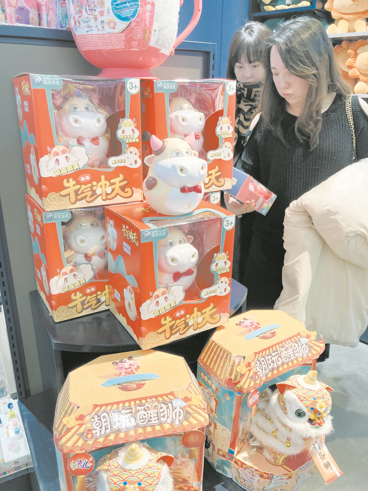 在万达商场内,某礼品店店员告诉记者:“牛气冲天啊!不少家长给孩子买这种玩具,一方面好玩,一方面图个喜庆。”在一些儿童服装店内,印有牛图案的儿童鞋帽和服装也纷纷上市。在市区几家珠宝店柜台内,各式各样金牛形状的吊坠、戒指、手链等饰品,吸引了不少顾客。“牛”就这样悄悄取代了“鼠”,被摆在柜台醒目位置。