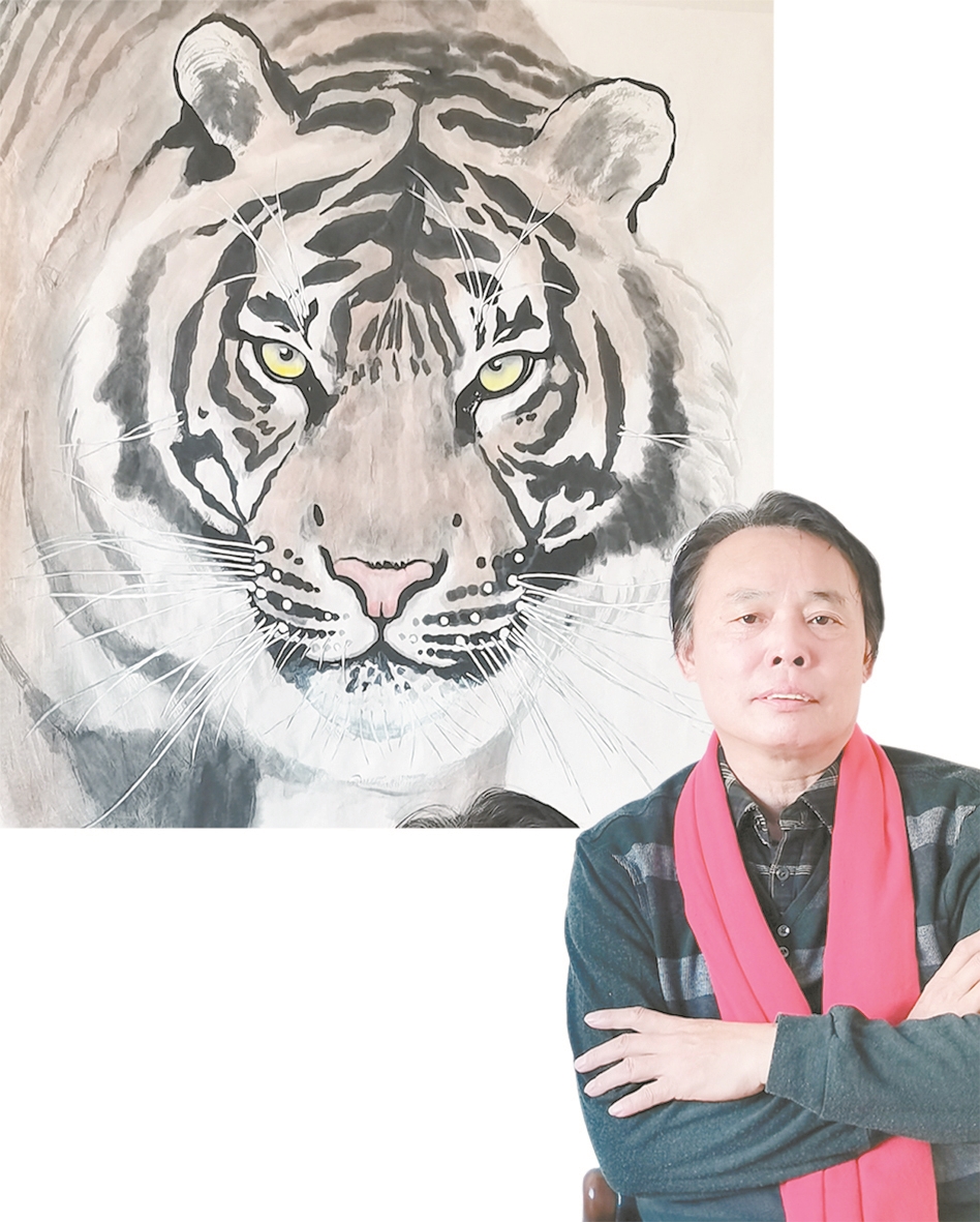 谈到画虎,程义伟说:“很多人画虎画全身,而我专注于画虎头。目前,业内画虎作品以工笔画、油画居多,我是以中国写意画的笔法画虎的,突出虎眼传达神韵,体现虎的威猛勇敢和王者之气。”他坦言,“如今,我的虎首作品已经超越了牛。未来一段时间的创作,我也将以画虎头为主。可以说,大家对虎首画作的认可,也是因为我画出了虎的文化精神。”