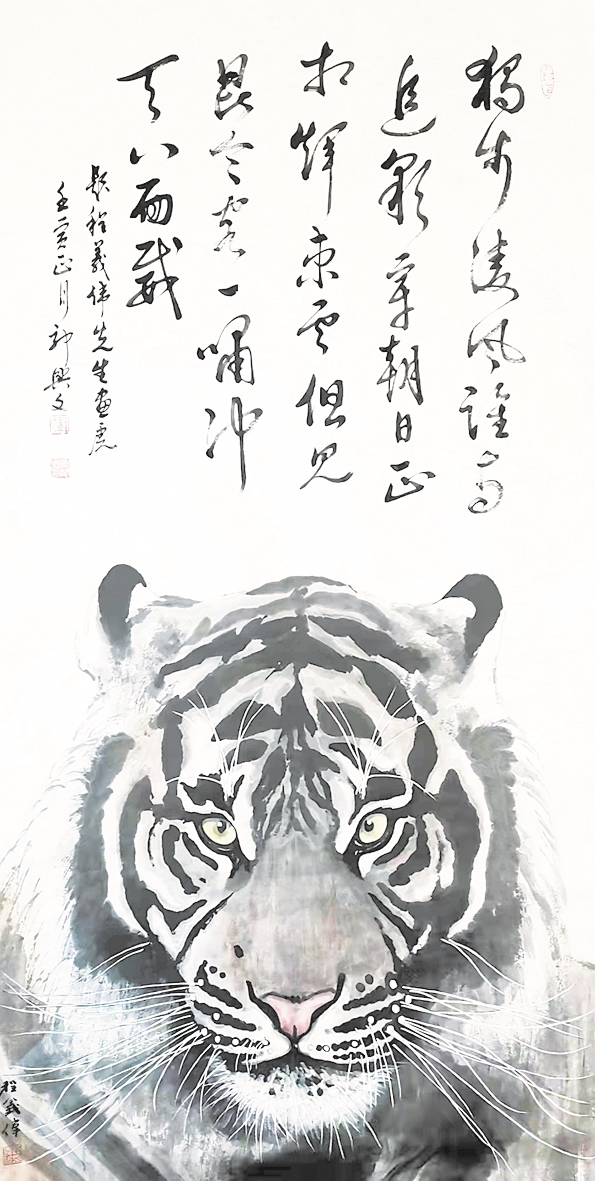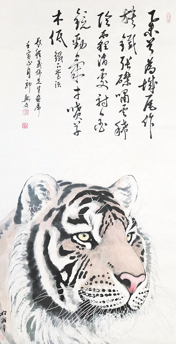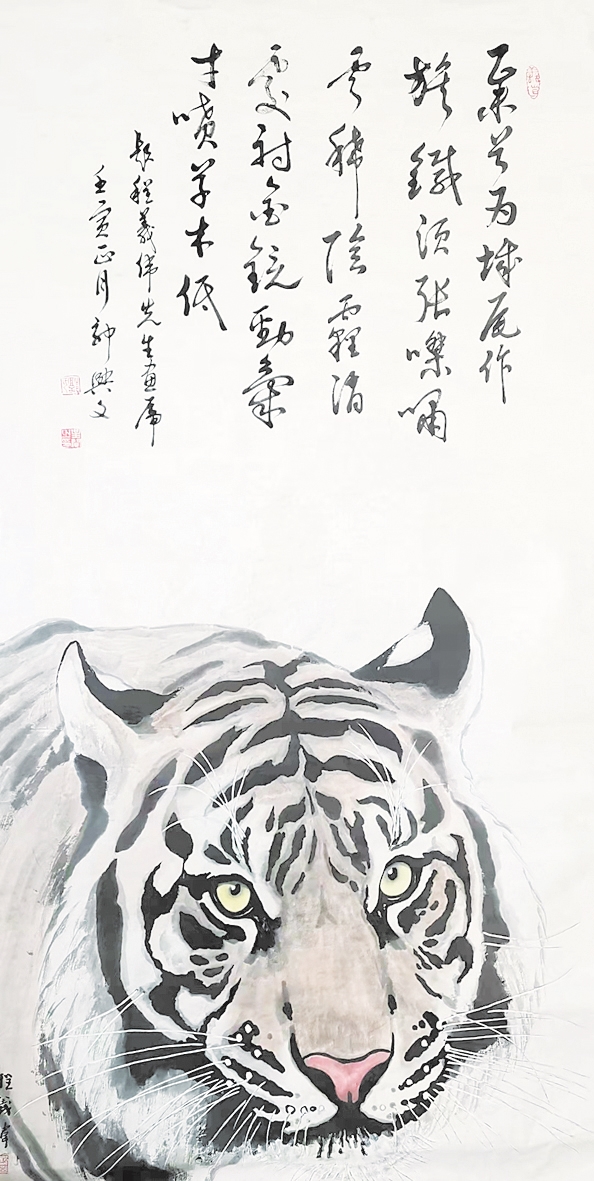 程义伟,辽宁社会科学院文学研究所原所长,数十载从事文艺理论研究。他撰写的《沈阳当代美术史》和《辽宁当代美术史》,填补了沈阳市和辽宁省空白,奠定了辽宁书画在全国的艺术地位。他还是当代著名山水画家,又因善于画牛,在业内有着“关东一牛”的美誉。从去年开始,程义伟潜心研究画虎,截至目前已经创作了近百幅虎头。这些画作在营口、沈阳等地展出后,引起极大反响,业内评价颇高。近日,辽宁省文化和旅游厅原厅长、辽宁省文联名誉主席郭兴文为他的数幅虎首画作题诗,进一步提升了作品影响力。