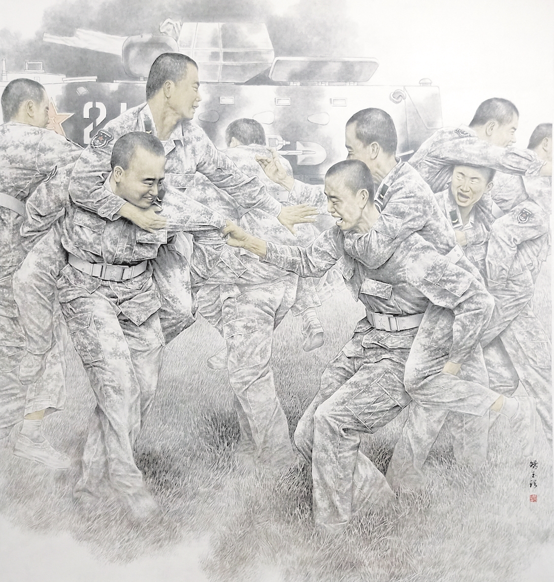 矫玉珍擅长军事题材,在展现中国军人的精神世界和军营生活方面有着自己深刻的理解和把握,从而绘出了一组组有灵魂、有情感、有血性的军人形象。在作品《血性男儿》中,他画出了一名普通战士丰满的血肉和鲜明的个性,对人物的喜怒哀乐和心理状态作了细致入微的描绘,塑造了真切可信、由平凡走向不凡的“这一个”艺术形象,因为“我是从部队基层走出来的,最了解战士们了。”从军40多年,矫玉珍以自己的人生经历和心灵体验为主要依托进行创作,他的人物画创作和他本人的精神、气质非常相近。
