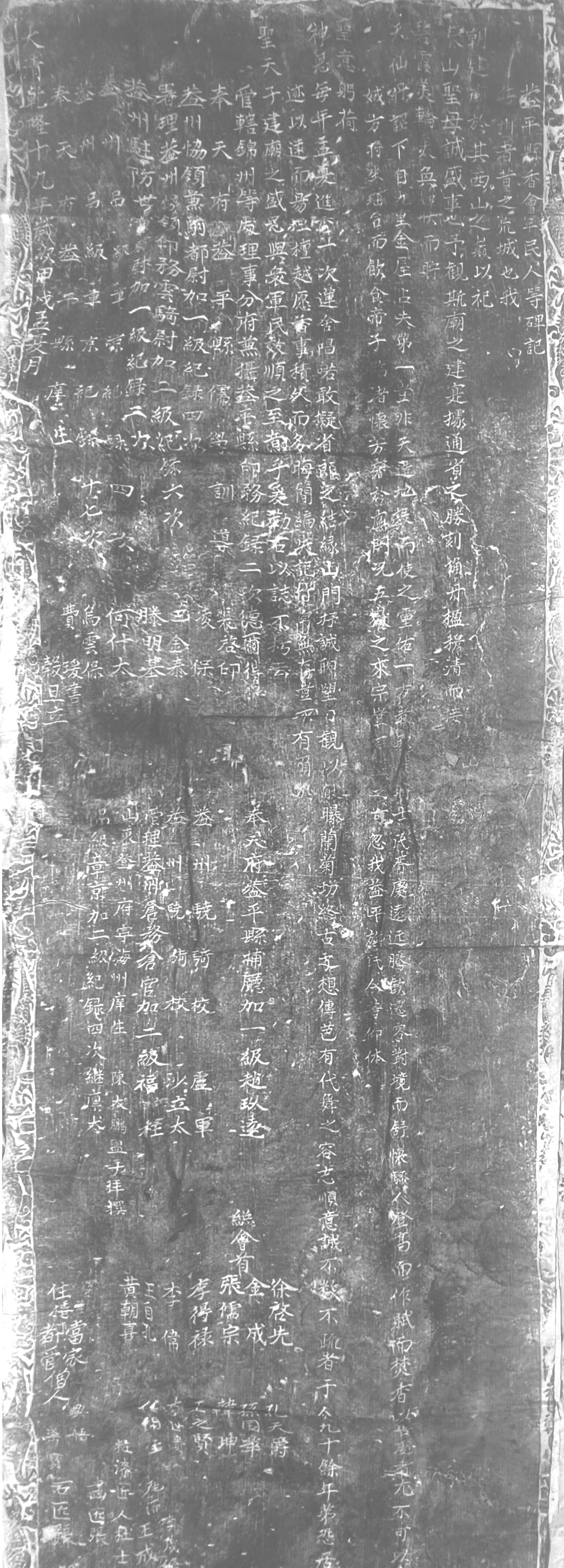 在这次回流的13张碑文拓片中,有5张是关于大石桥市迷镇山娘娘庙的,分别是清《创修耀州娘娘庙戏楼碑记》(清康熙五十一年 1712 );清《娘娘庙碑记》 (清康熙五十六年 1717 );清《太山天仙圣母碑记序》 (清康熙六十一年 1722 );清《太山天仙圣母碑记》(清雍正五年 1727 );清《香炉庄善士立碑序》 (清嘉庆十九年 1814 )。