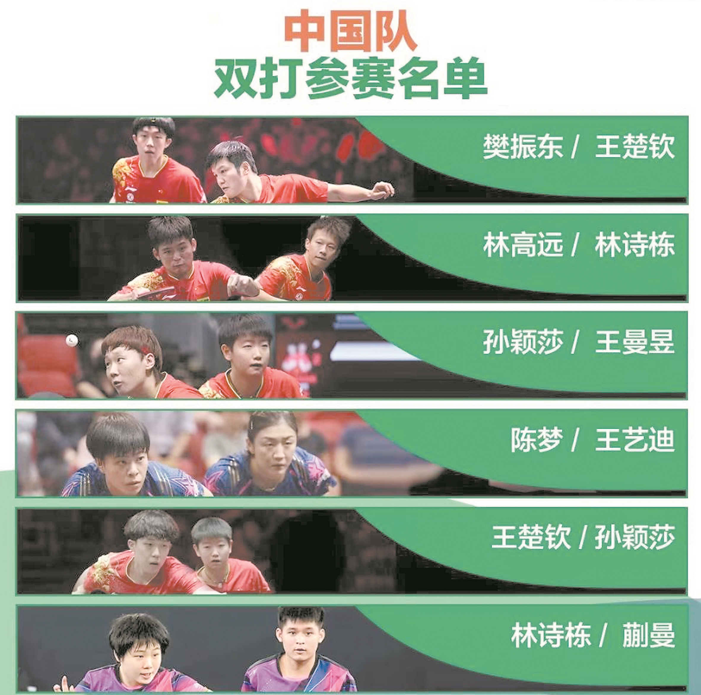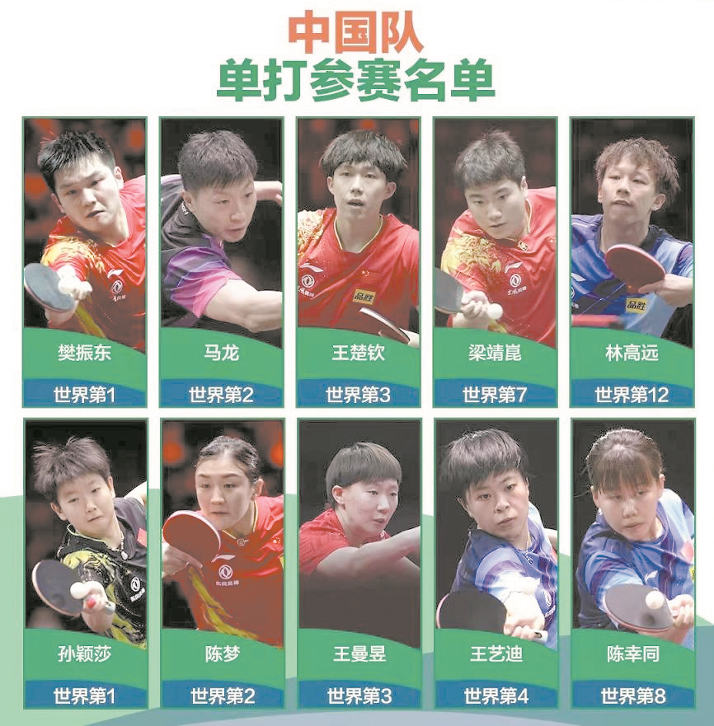 中国乒乓球队德班世乒赛参赛名单3日公布。这是一份“老中青”结合的名单,12名运动员中,既有马龙这样大赛经验丰富的老将,也有单打世界第一樊振东和孙颖莎这样的中坚力量,小将林诗栋和蒯曼入选名单则令人眼前一亮。