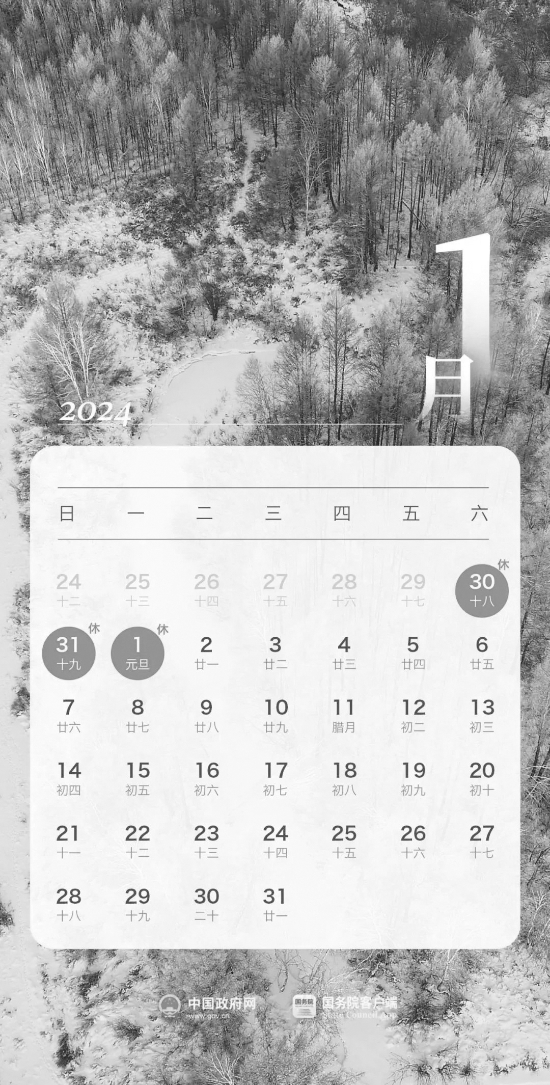 10月25日,国务院办公厅发布2024年元旦、春节、清明节、劳动节、端午节、中秋节和国庆节放假调休日期的具体安排,通知如下: