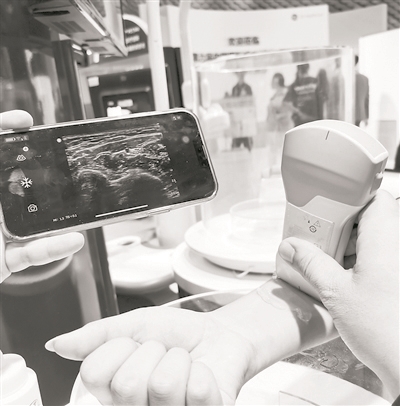 “这个超声设备有双面探头,大的一端可以对肝、胆、胰、脾、肾等腹部脏器进行超声检查,小的一端可以检查甲状腺、乳腺、关节等器官。它可以通过App连接手机或平板电脑,用户可以在这些设备上查看影像以及相关数据。”该产品相关负责人纪平对科技日报记者说。