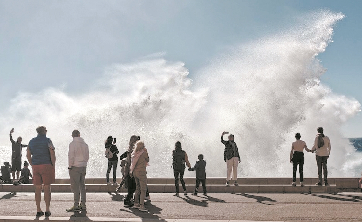 图3 近日,受风暴天气影响,法国尼斯海岸巨浪拍岸,吸引人们驻足观看。图为人们在法国南部城市尼斯的海边观浪。