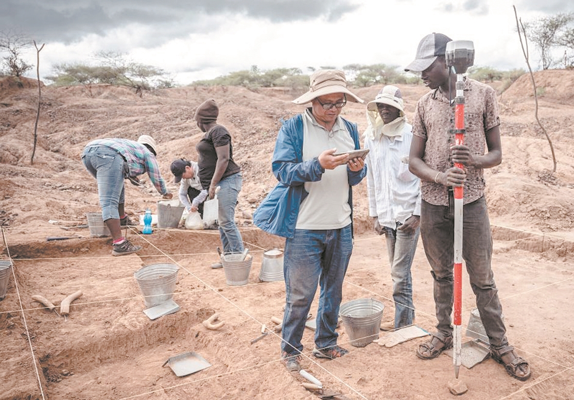 图4 近日,中肯联合考古队在肯尼亚博高利亚湖遗址新发现一处典型勒瓦娄哇技术制作石器的旧石器地点,为研究勒瓦娄哇技术的起源与传播、现代人起源等重大科学问题提供了十分重要的线索。图为中肯联合考古队队员顾雪军(右三)在位于肯尼亚巴林戈郡马里加特镇的考古现场测量石器坐标位置。
