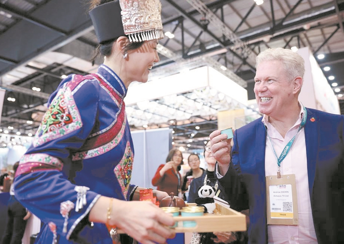 图6 2023年英国伦敦世界旅游交易会日前在伦敦展览中心举行,以“你好!中国”中国国家旅游形象为主题的中国展区在交易会亮相。图为一名男子在英国伦敦世界旅游交易会中国展区品尝中国茶。