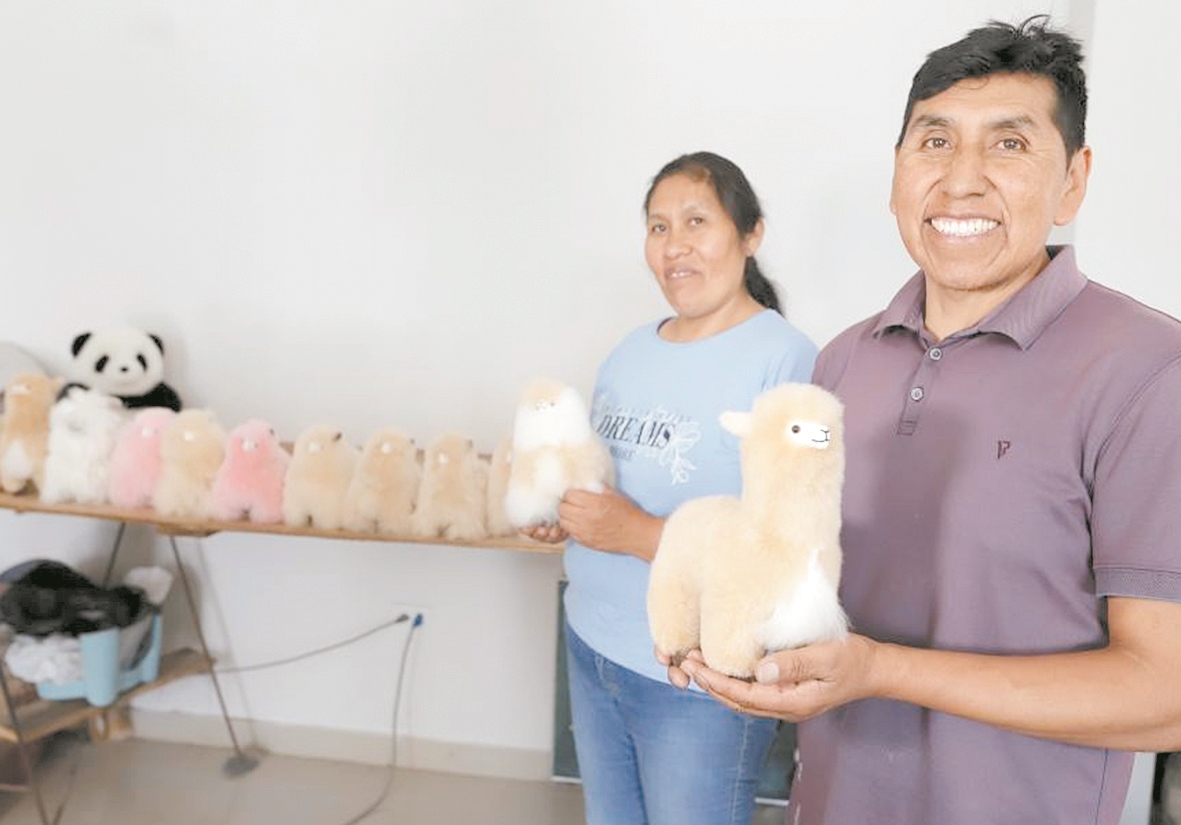 图7 2016年,中国姑娘马玉霞在秘鲁阿雷基帕街边市场购买了羊驼毛玩偶并引入中国市场,马马尼大叔因此开始与中国市场合作。通过连续五届进博会,马马尼大叔的羊驼毛制品在中国市场大受欢迎,并创立了中文品牌“温暖驼”。马马尼大叔和妻子终于在第六届进博会来到上海,感受到了中国市场的繁荣和活力,并希望有更多乡亲来到中国,拓展发展空间。图为秘鲁南部城市阿雷基帕的工坊内,马马尼大叔(右)和妻子格洛丽亚展示羊驼玩偶。