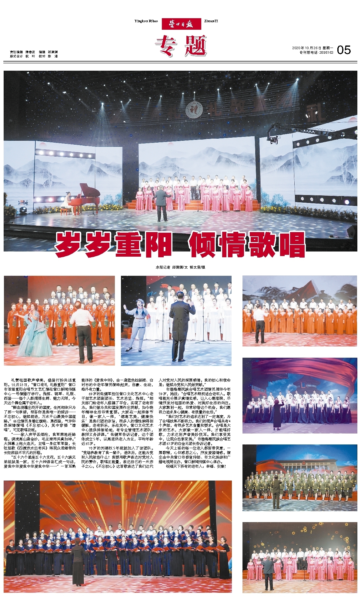 本报讯 记者刘征 王亚明 李喻政报道 “营口有礼 礼敬重阳”营口市首届重阳合唱节文艺汇演10月23日下午在营口新闻传媒中心演播大厅上演。